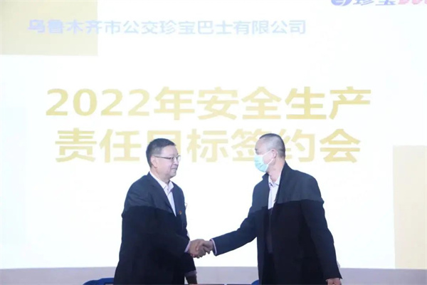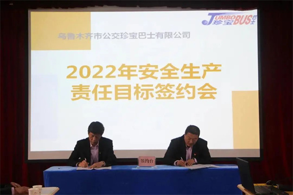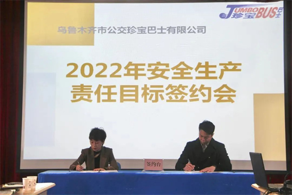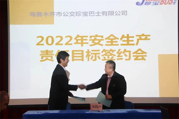 会上,公司安委会主任与副主任,公司总经理与各分管领导,公司各分管领导与相关部门分别签订了2022年乌鲁木齐珍宝巴士有限公司安全生产责任状。
