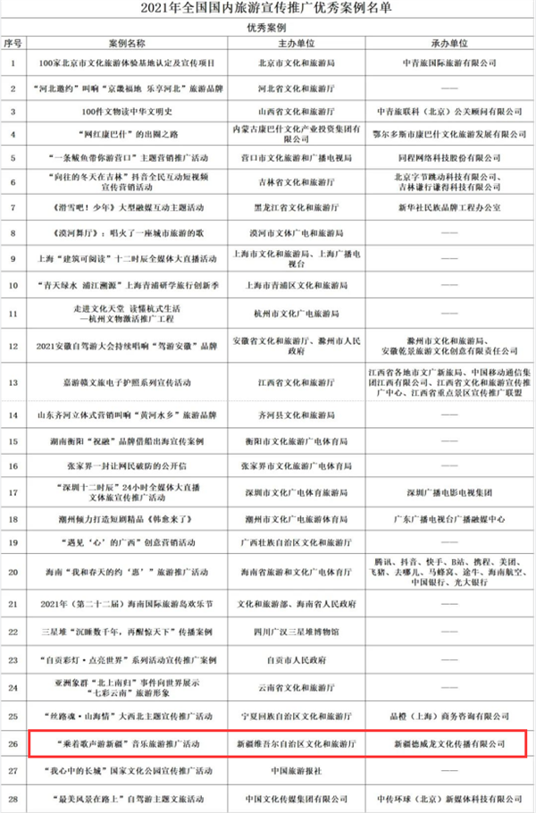 根据《文化和旅游部资源开发司关于推荐2021年国内旅游宣传推广优秀案例的通知》(资源函〔2022〕1号)要求,经有关省级文化和旅游行政部门、文化和旅游部有关直属单位推荐,本着树标杆、立典范、强引领原则,经专家组评选,确定28个案例为2021年国内旅游宣传推广优秀案例。现将案例名单予以公布。