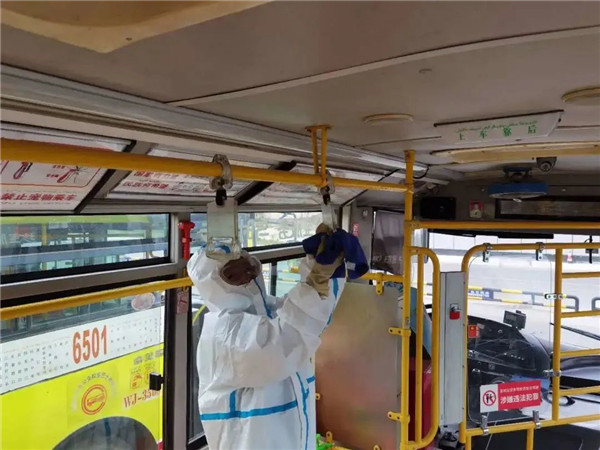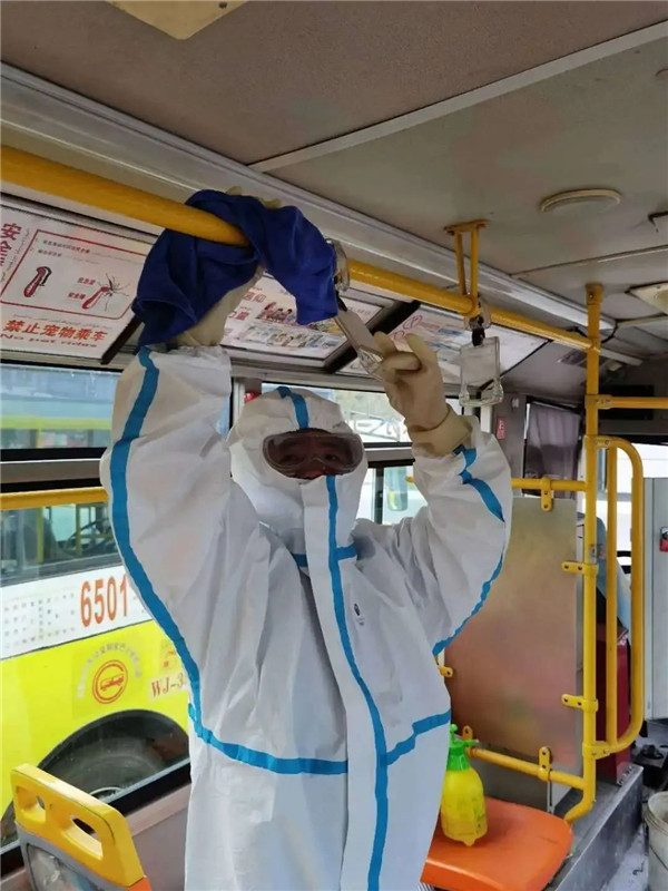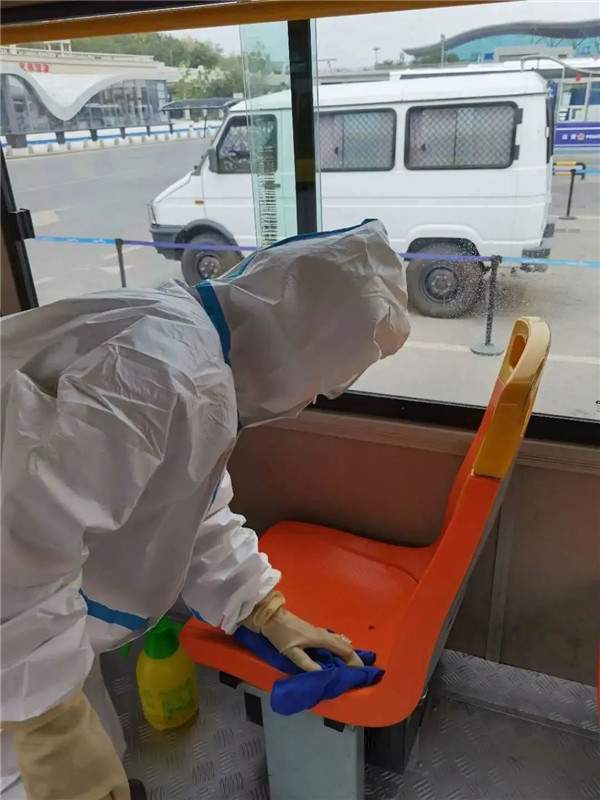 公司对参加应急保障公交车辆进行严格消毒,早、晚各消毒一次,驾驶人员在应急保障过程中全程佩戴口罩,对车内扶手、座椅等易接触部位进行擦拭、消毒,做好卫生保洁、通风和车辆消毒工作。