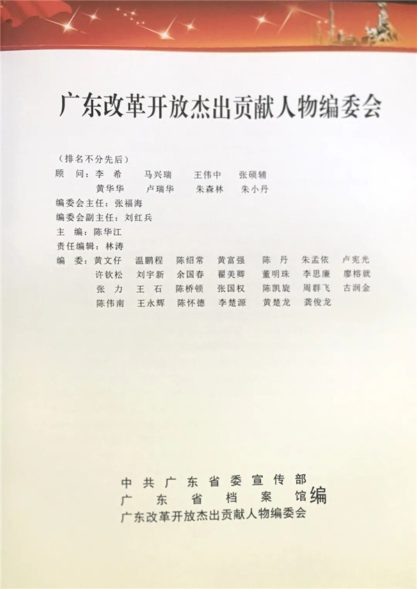 为了表彰和宣传在各条战线上为广东改革开放事业做出过突出贡献的创业者,真实再现他们的创业之路,由红旗出版社以纪实、简史和人物传记的形式汇编发行《广东改革开放杰出贡献人物》。
