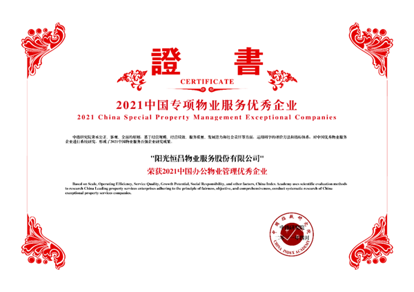 在公司斩获三项荣誉的同时,阳光恒昌物业服务品牌“安立方”下属的北京市顺义区医院、大兴机场公共区管理部武警用房项目、河南商会大厦、宝鸡市文化艺术中心、西安市碑林区东门市民中心等项目获评“2021中国物业服务五星级项目”荣誉。